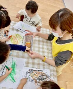 これまで「お絵描き=塗り絵」となりがちだった活動に、ぐるぐる描きや波線をなぞるなど、 身体の動きを伴う表現を取り入れることで、活動の質の向上にもつながっています。