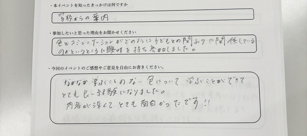 ”色とコミュニケーションがどのように子どもとの関わりに関係してるのかというところに興味を持ち参加しました。なかなか学ぶこものない色について、学ぶことができてとても良い経験になりました。内容が深くて、とても面白かったです!!”